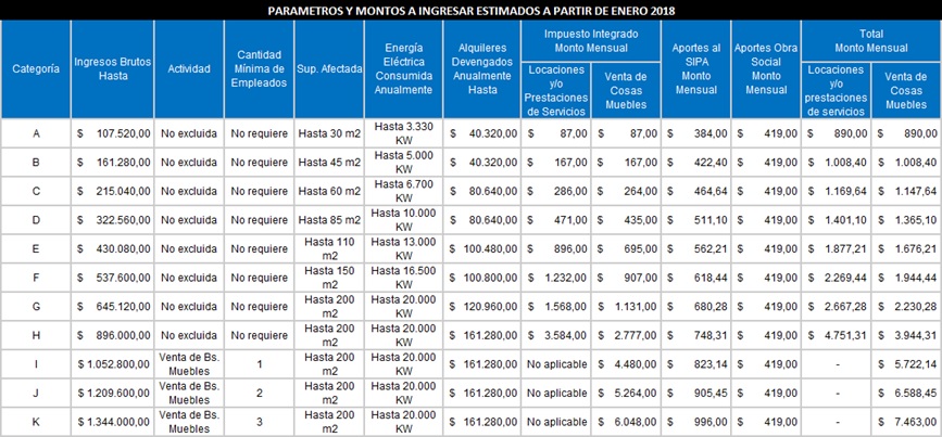 La Ley N°27.346 estableció modificaciones respecto a la actualización de las escalas de cada una de las categorías y del importe mensual a ingresar al fisco por parte de los contribuyentes dejando de lado la facultad de la AFIP para hacerlo y obligando a una actualización anual de acuerdo al índice de movilidad jubilatoria.